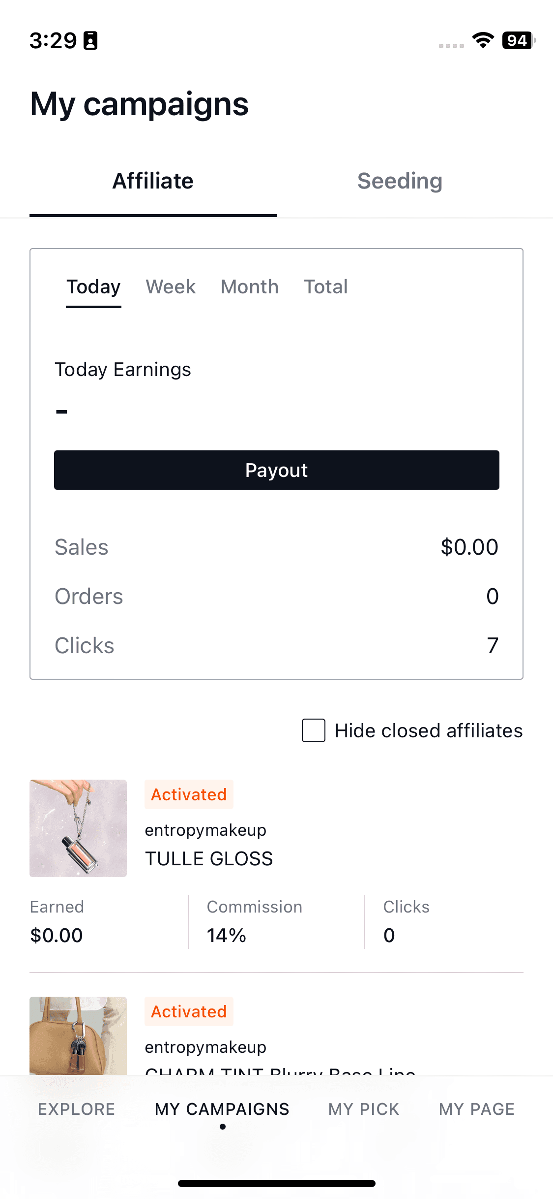 In the My Campaign menu, under the Affiliate tab, you can check the status of the affiliates you have applied for.