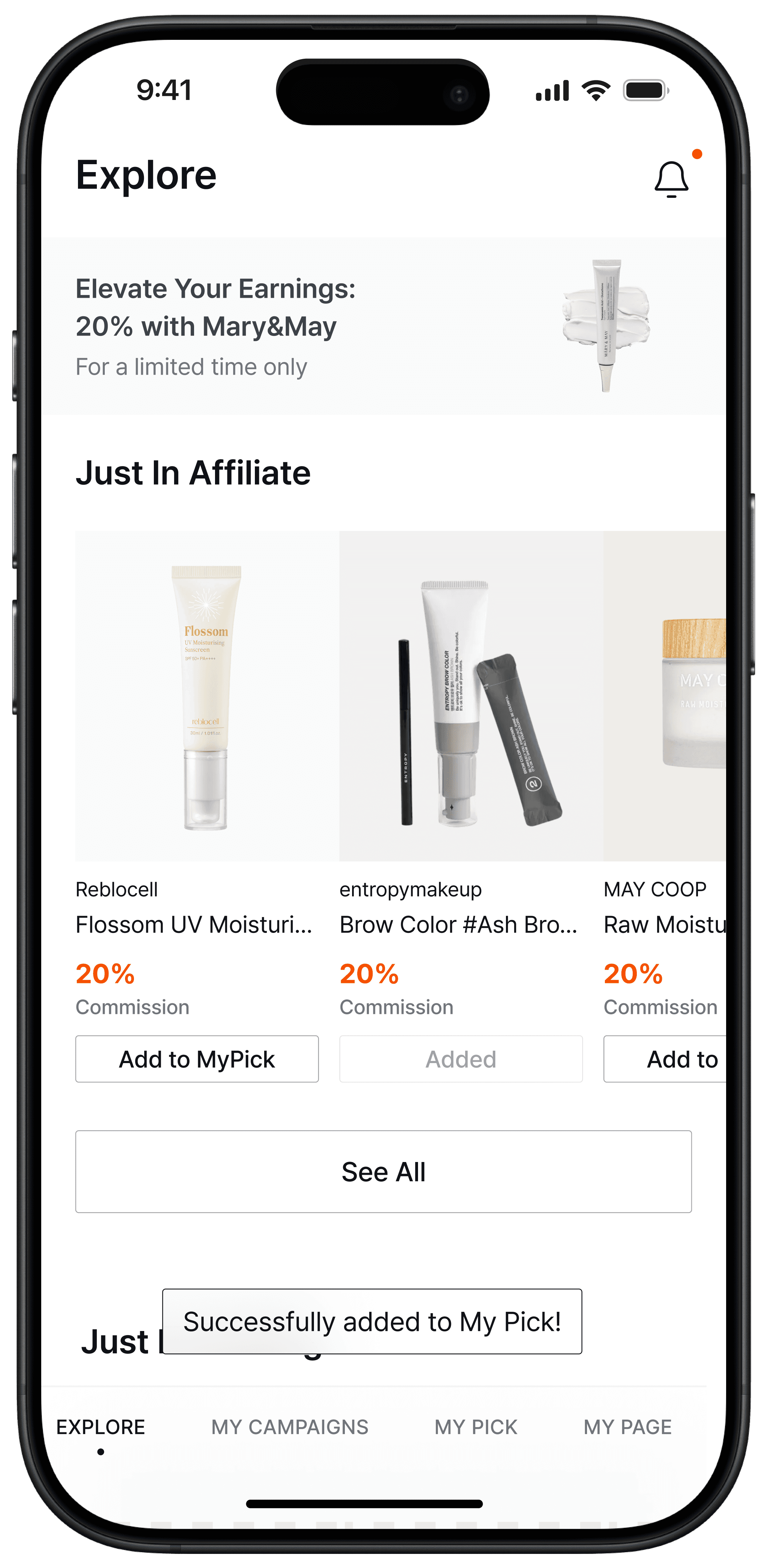 Click the Add to MyPick button for the affiliate product you want to apply for, and it will be applied immediately.